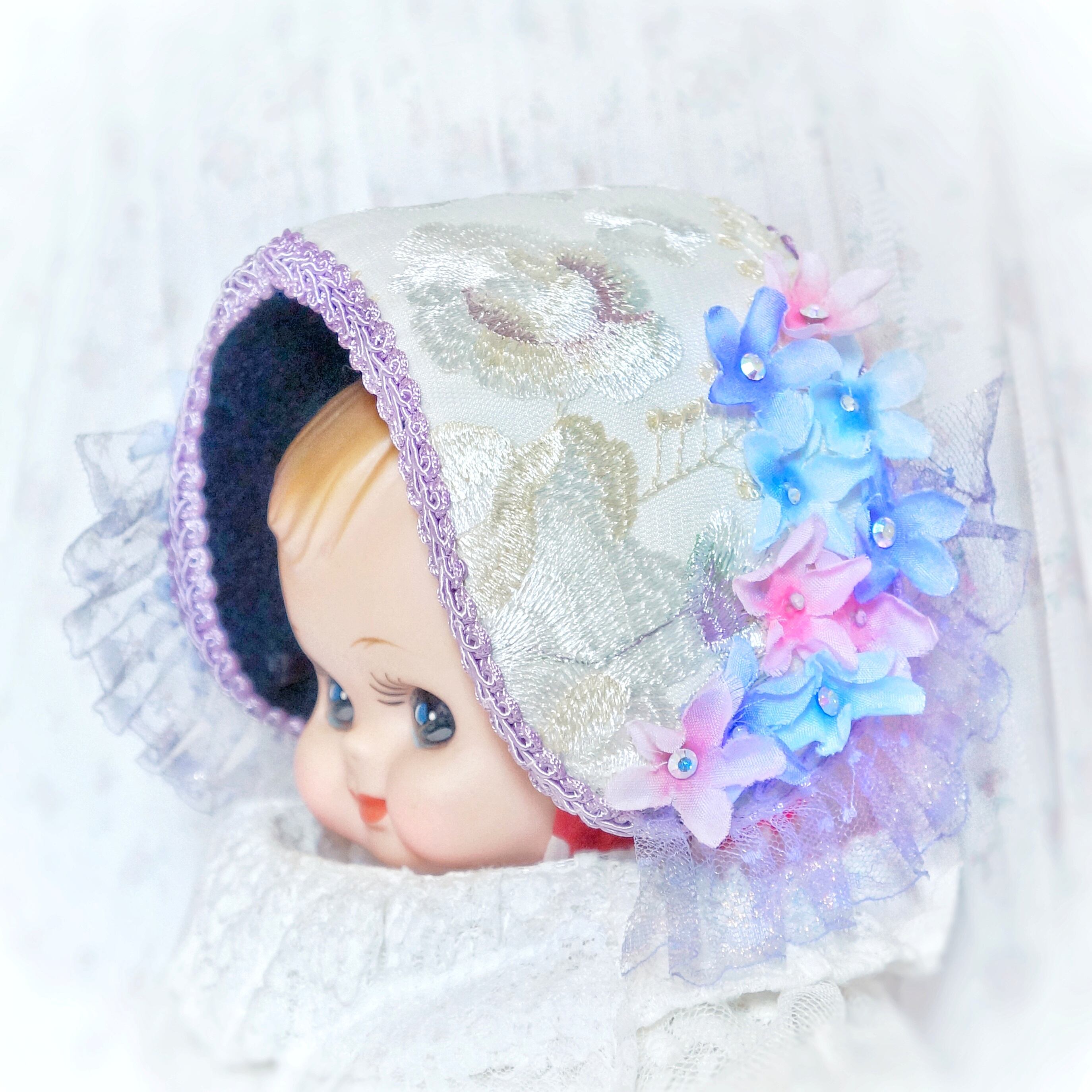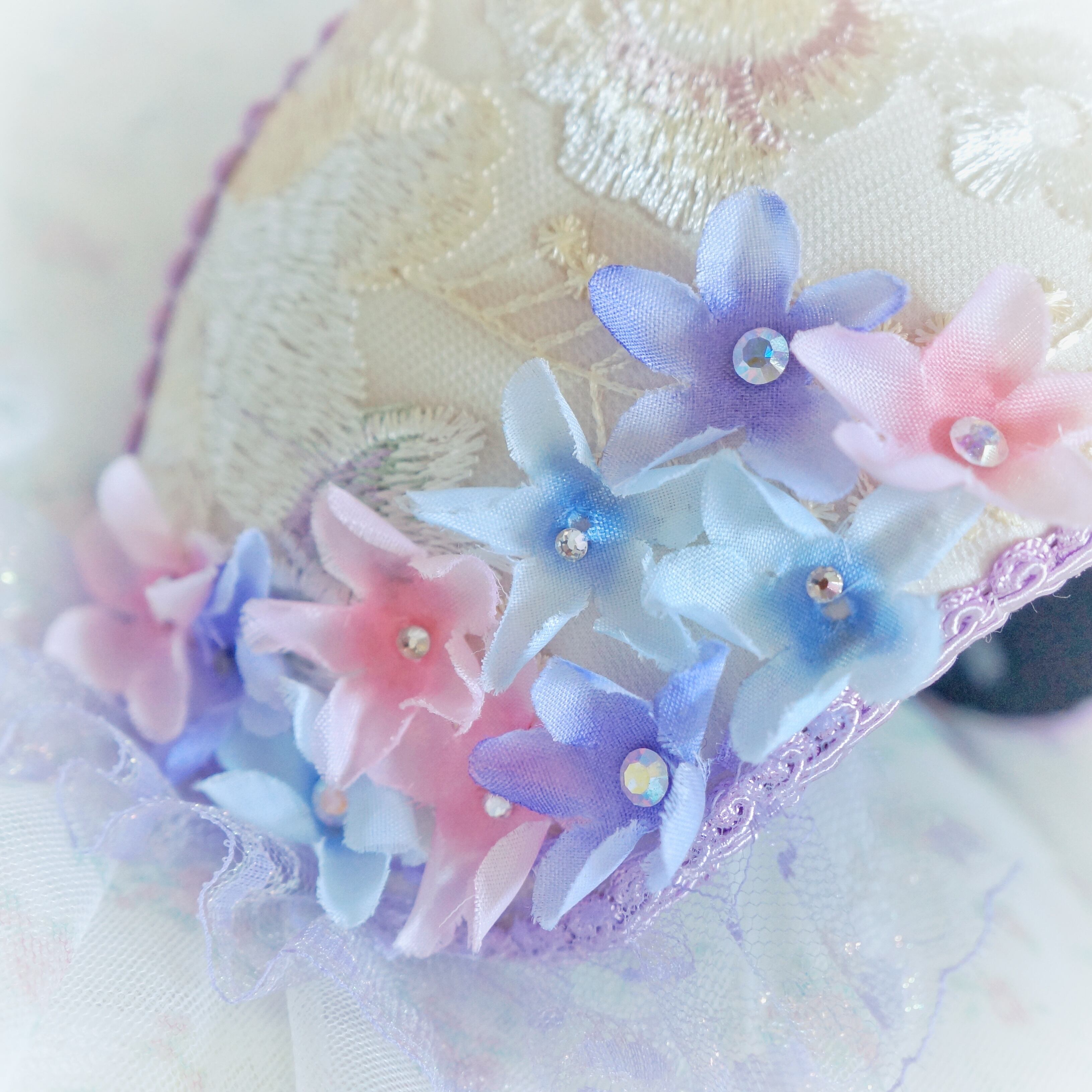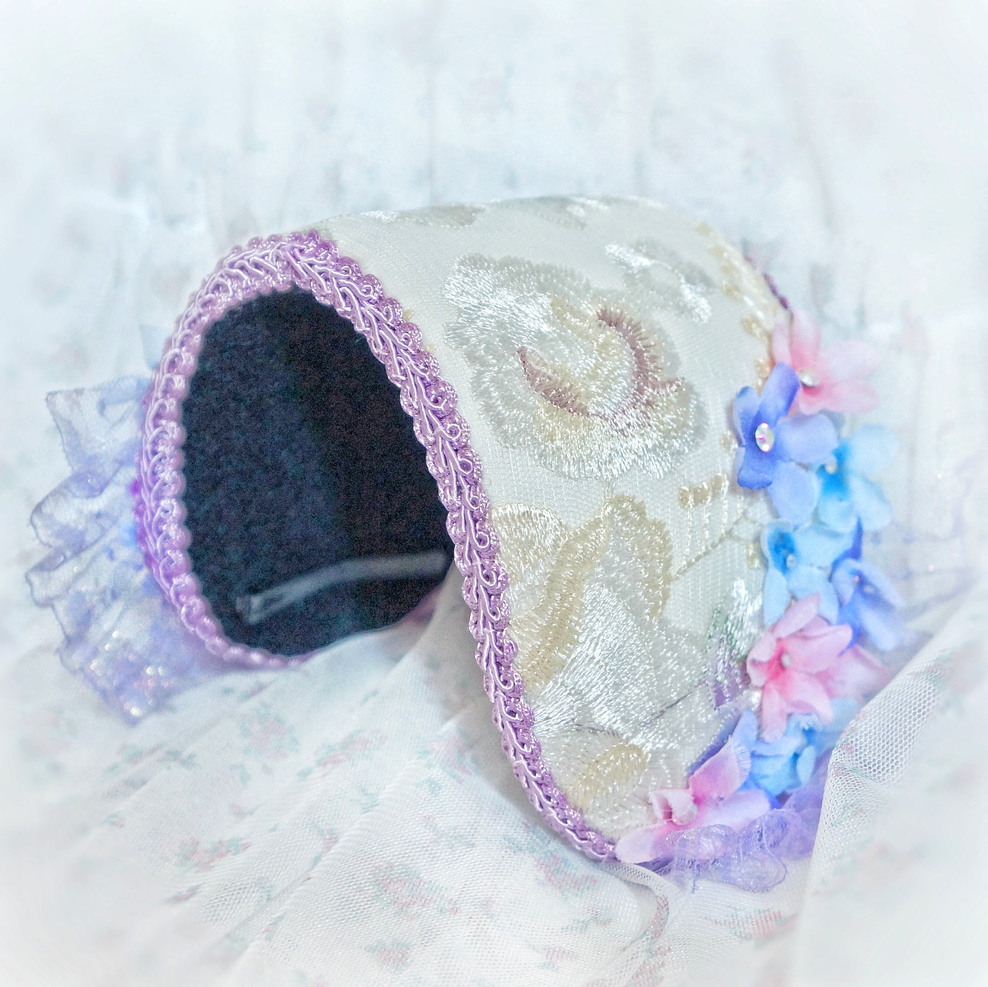 みつかじょボンネット『雨粒紫陽花』は、可憐な紫陽花の花びらをイメージしたデザインのボンネットです。華やかな色合いが、どんなコーディネートにも華を添え、特別な日のお出かけにぴったりのアイテムです。