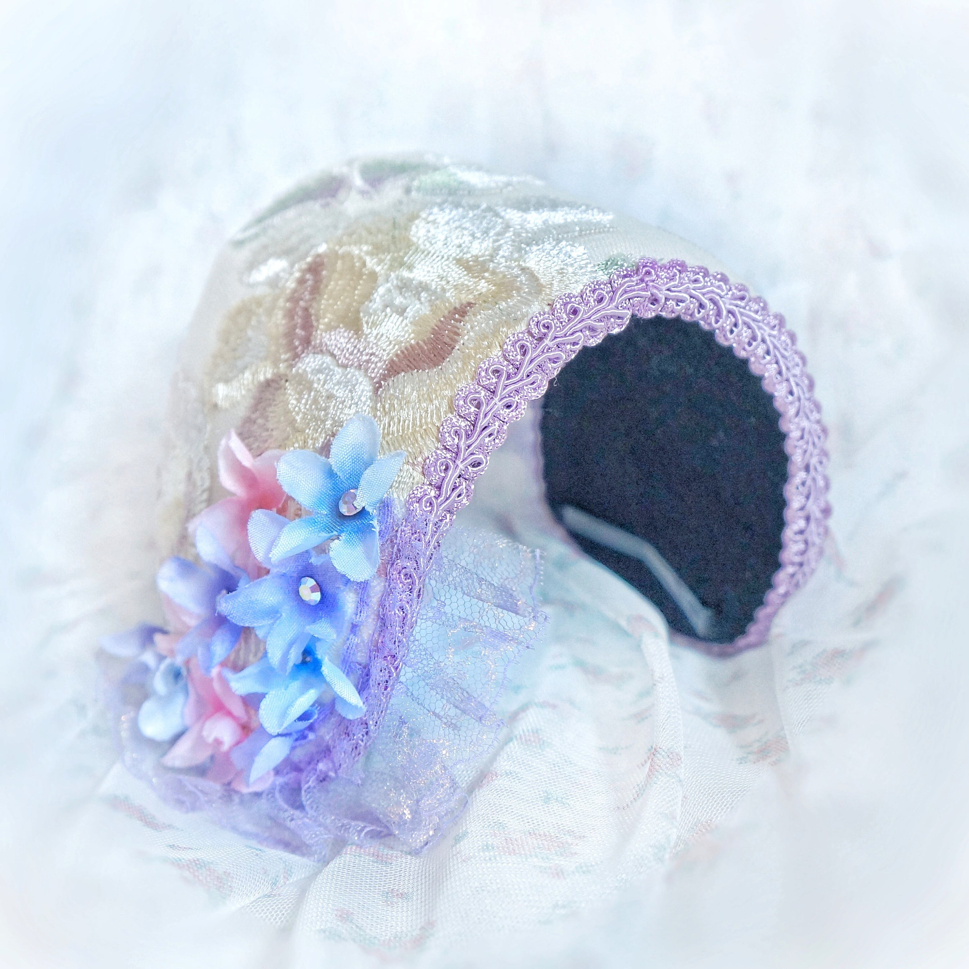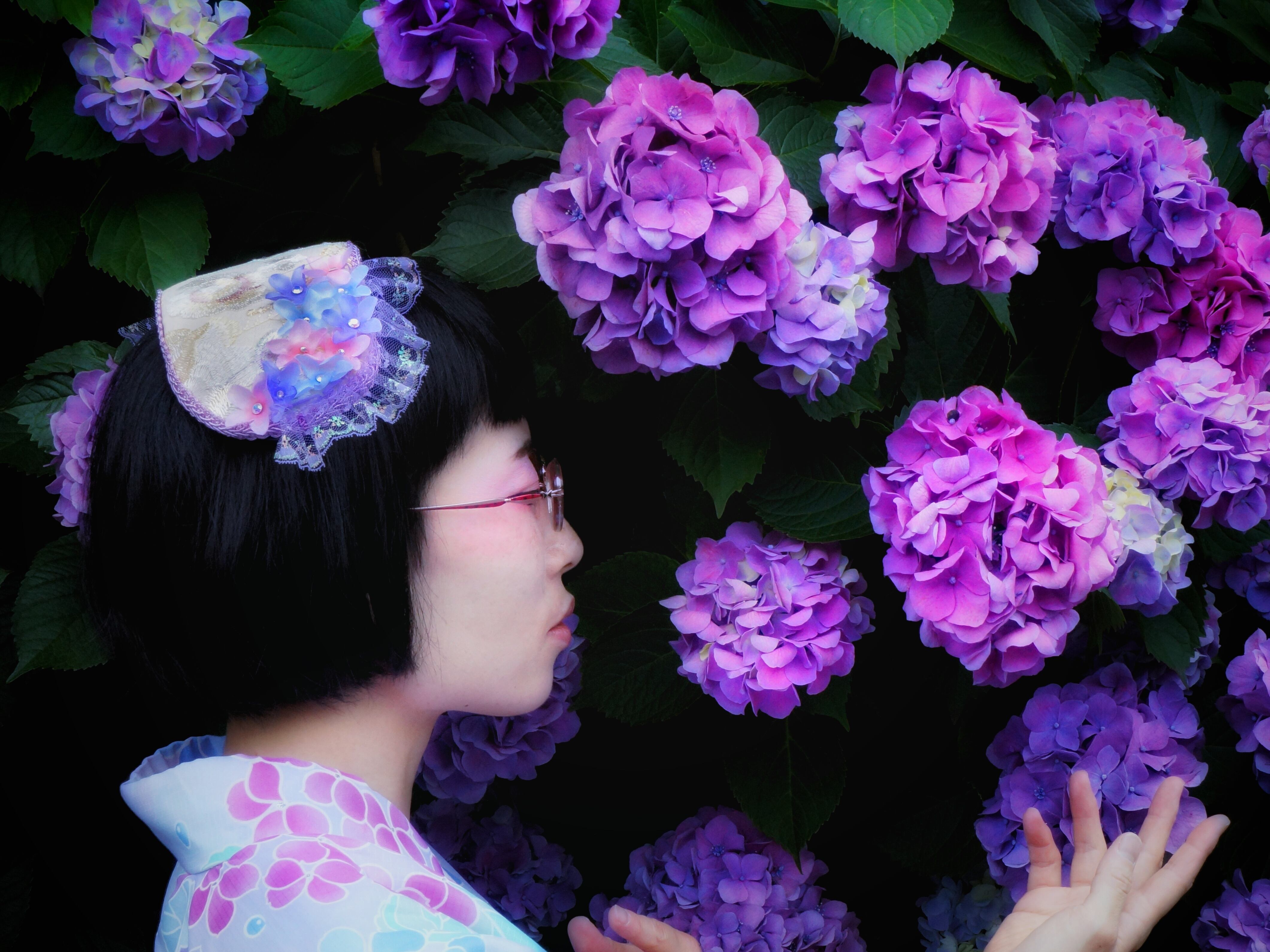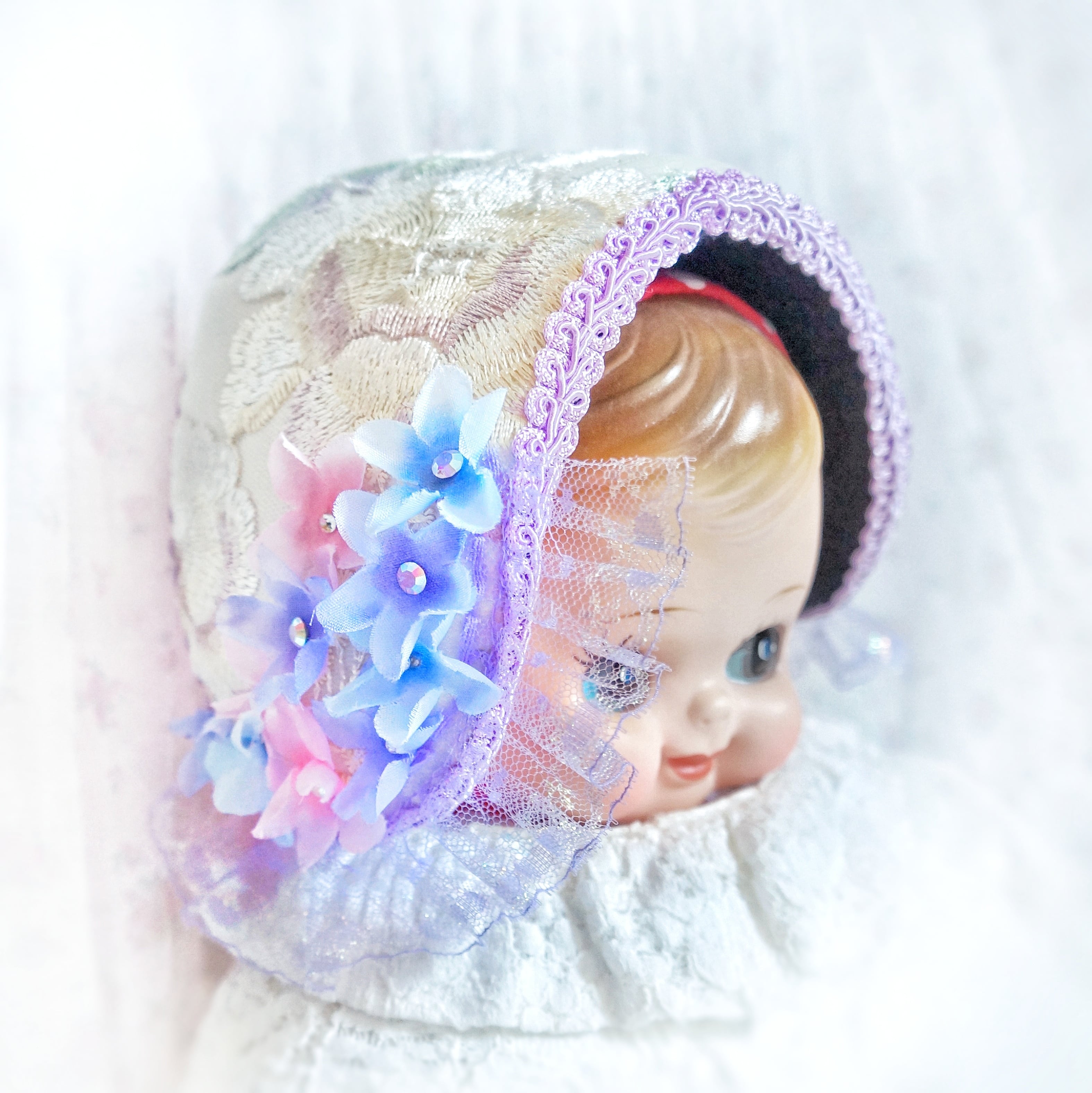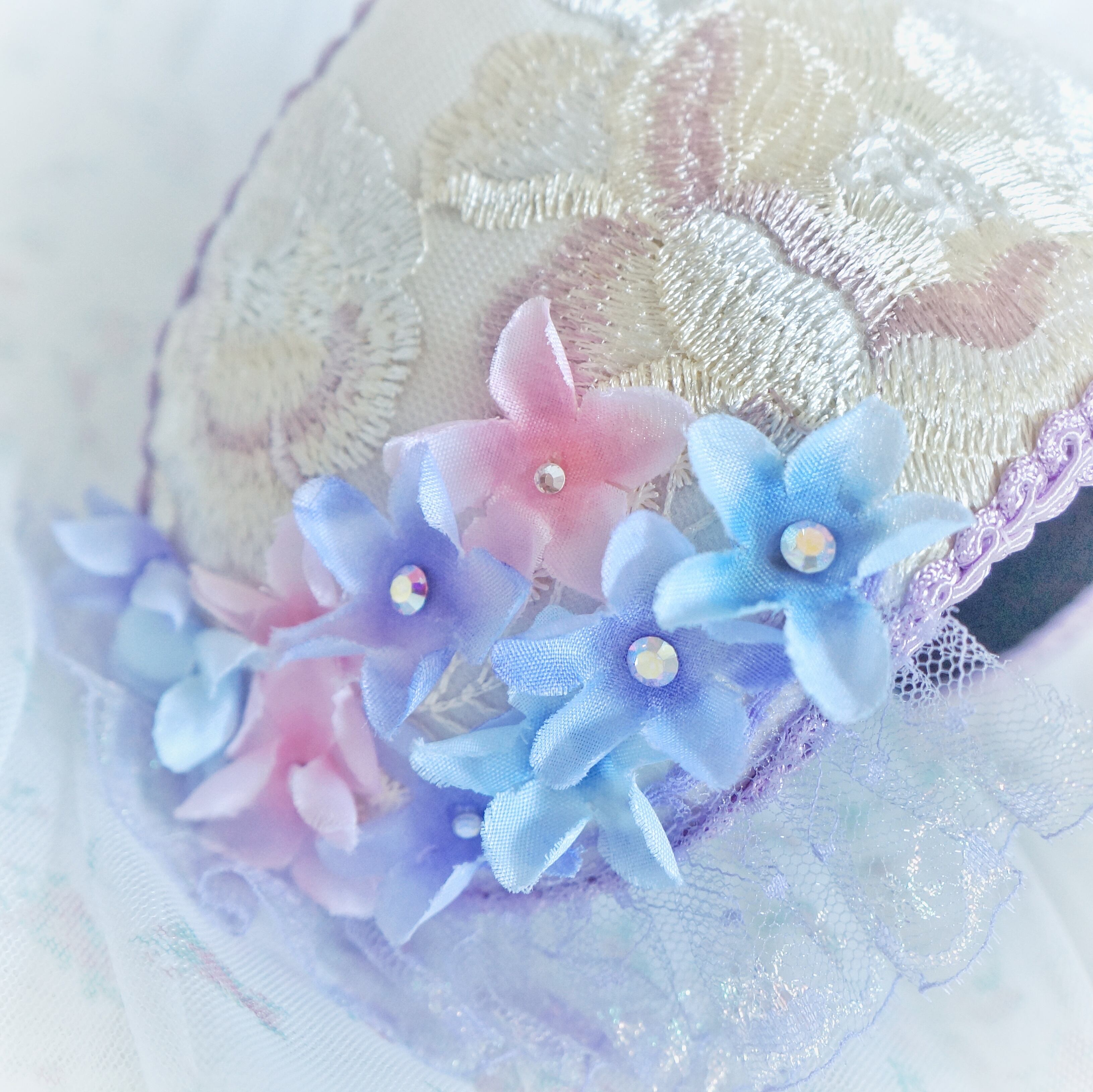 みつかじょボンネット『雨粒紫陽花』は、可憐な紫陽花の花びらをイメージしたデザインのボンネットです。華やかな色合いが、どんなコーディネートにも華を添え、特別な日のお出かけにぴったりのアイテムです。